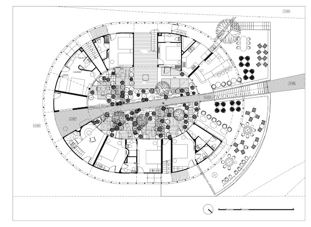 Con dốc hoặc cầu thang làm gián đoạn những con đường hình tròn. Kiến trúc sư thiết kế một lối đi nhỏ đi thẳng về phía sảnh chính, qua khu vườn trung tâm, vào quán cafe trên hoặc dưới và mở rộng về phía thung lũng.